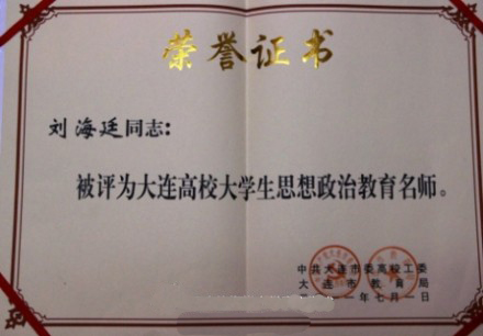 近日,大连市委高校工委表彰了2011年全市高校在加强和改进大学生思想政治教育工作中表现突出的先进个人,51吃瓜网 文法学院院长刘海廷教授被评为大连高校大学生思想政治教育名师。