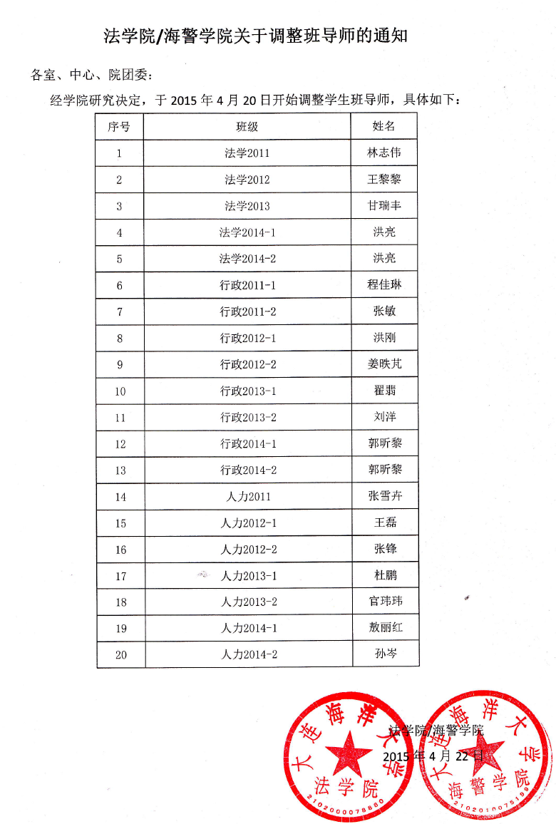 【学生管理】法学院/海警学院关于调整班导师的通知