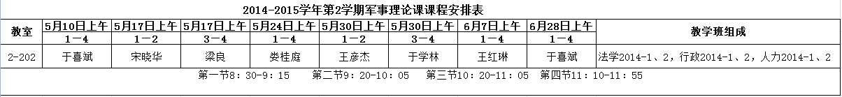 2014级军事理论课程已经安排完毕,请各班负责人通知学生根据《2014~2015学年第二学期军事理论课程安排》上课。