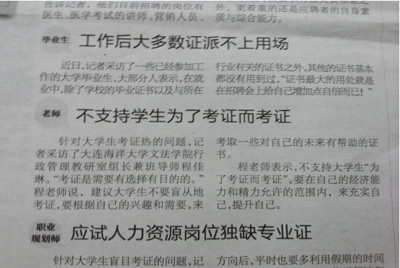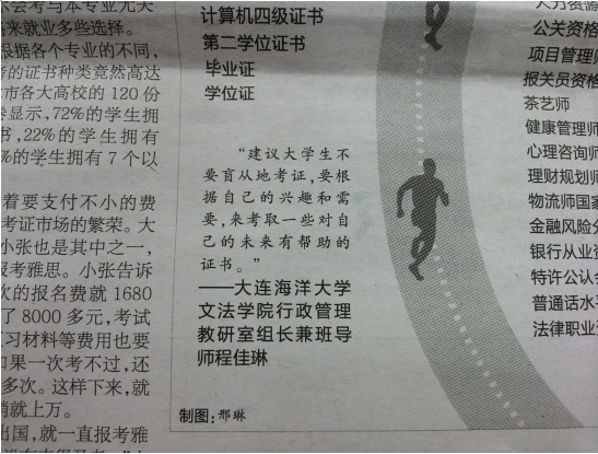 4月15日,《半岛晨报》刊登题为《百余证书供你考 起作用的没几个》的新闻报道,该篇报道主要反映大学生盲目考证的“证途”现象,并呈现了社会相关方面人士对此的观点。我校文法学院行政管理教研室组长兼班导师程佳琳为受访对象之一,从大学老师的角度阐述了对大学生盲目考证的看法并提出建议,为我校带来积极影响。