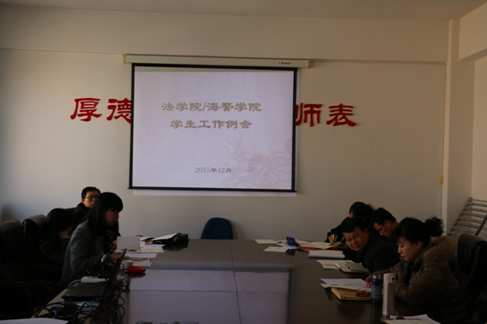 2015年12月2日,法学院/海警学院在学院六楼会议室举行了学生工作系列交流研讨总结会议。本次会议主要针对前三次学生工作交流研讨进行总结。学院班子成员以及全体教师参加了此次会议。