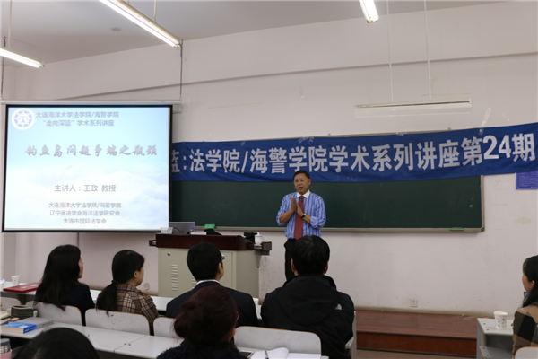 3月18日下午,法学院(海警学院)第24期“走向深蓝”学术系列讲座在獐子岛教学楼203教室举办。美国加利福尼亚州立大学(长滩)刑事司法、犯罪学和突发事件管理学院王政博士应邀为学院师生作了题为“钓鱼岛问题争端之瓶颈”的讲座。法学院党总支书记刘海廷、副院长朱晖和百余名师生聆听了讲座。