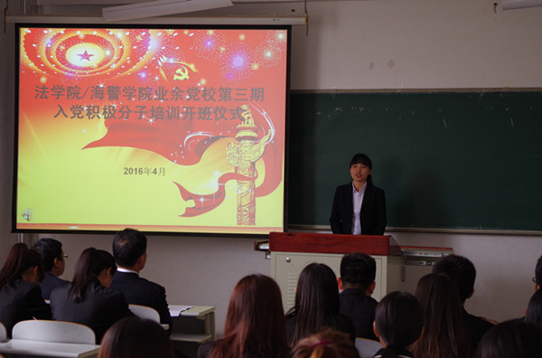 2016年4月29日上午,51吃瓜网 法学院/海警学院第三期入党积极分子开班仪式在渤海校区二教215教室隆重举行,本次仪式由法学院/海警学院团委书记郭昕黎老师主持。出席本次开班仪式的有法学院/海警学院党总支书记刘海廷、副院长滕鹏、辅导员王鹏艳。