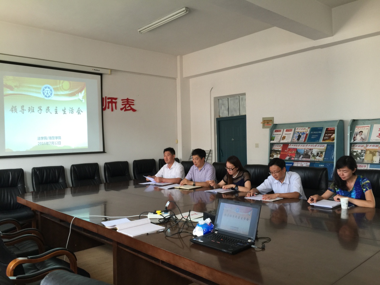 7月12日,法学院(海警学院)在学院六楼会议室召开领导班子专题民主生活会,党总支书记刘海廷、院长裴兆斌、副院长戴瑛和滕鹏参加了会议,副院长朱晖作为党外处级干部参加了会议。