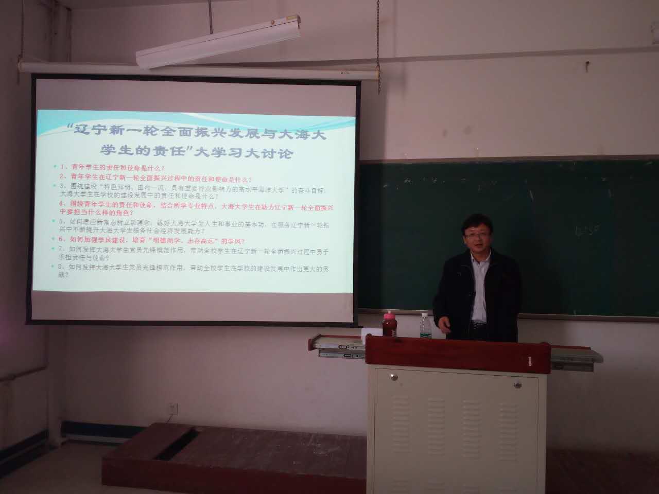 滕鹏首先详细介绍了辽宁新一轮全面振兴发展的大背景。结合“青年学生的责任和使命是什么?”、“青年学生在辽宁新一轮全面振兴过程中的责任和使命是什么?”、“围绕青年学生的责任和使命并结合所学专业特点,大海大学生在助力辽宁新一轮中要担当什么角色?”以及“如何加强学风建设,培育明德尚学、志存高远的学风?”等问题引发同学们的思考。