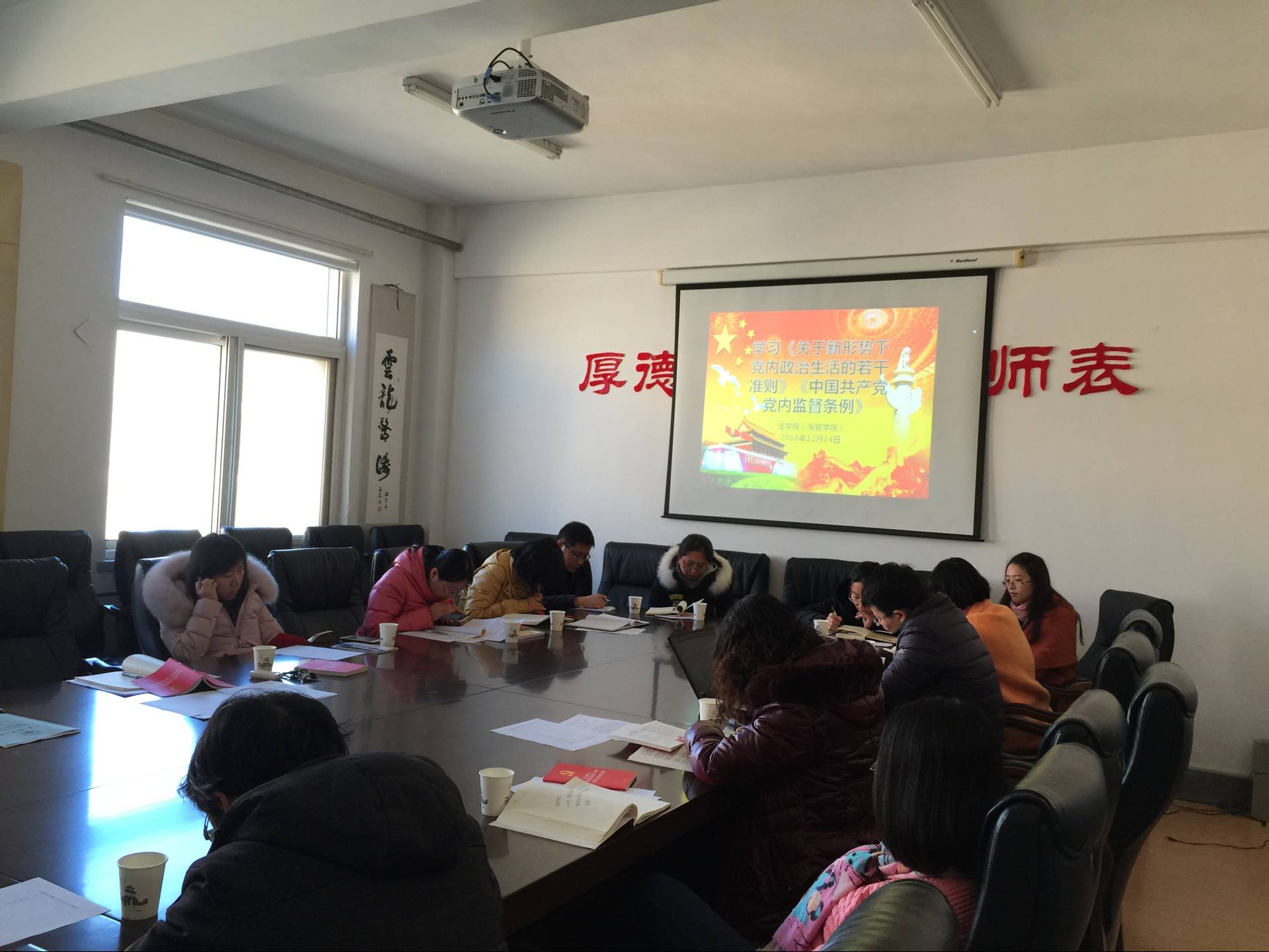 12月14日,在学院会议室召开学习《关于新形势下党内政治生活的若干准则》 《中国共产党党内监督条例》(以下简称《准则》和《条例》)专题会议,全体教师党员参加了会议,会议由党总支书记刘海廷主持。
