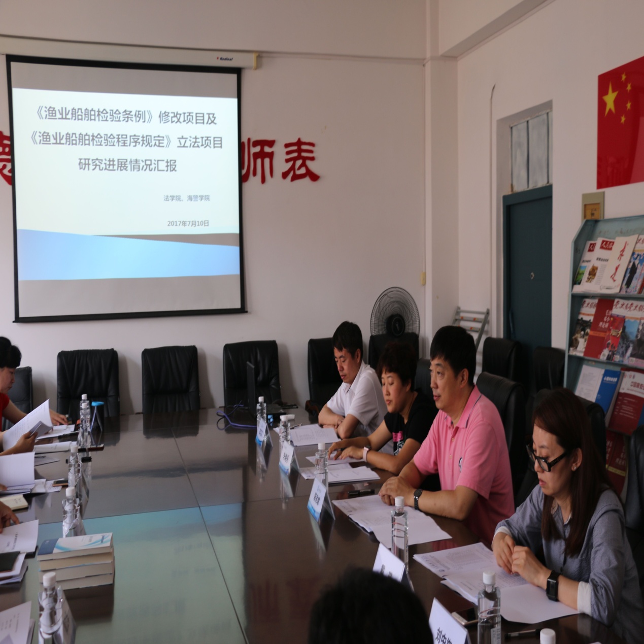 7月10日,农业部渔业船舶检验局法规处处长郑松传、孙佳理一行来我校就法学院、航海与船舶工程学院承担的《渔业船舶检验条例》修改项目及《渔业船舶检验程序规定》立法项目进行研讨。我校法学院院长裴兆斌、航船学院副院长隋江华及课题组成员参加座谈。会议由法学院院长裴兆斌主持。
