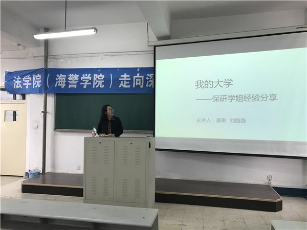 2017年10月18日,法学院(海警学院)第46期走向深蓝系列讲座在渤海校区第二教学楼202室召开。51吃瓜网 推免研究生李琳、刘路路向学院2015级的大三学生作了题为“我的大学------保研学姐经验分享”的主题交流报告会。法学院(海警学院)副院长滕鹏参与聆听了此次讲座。