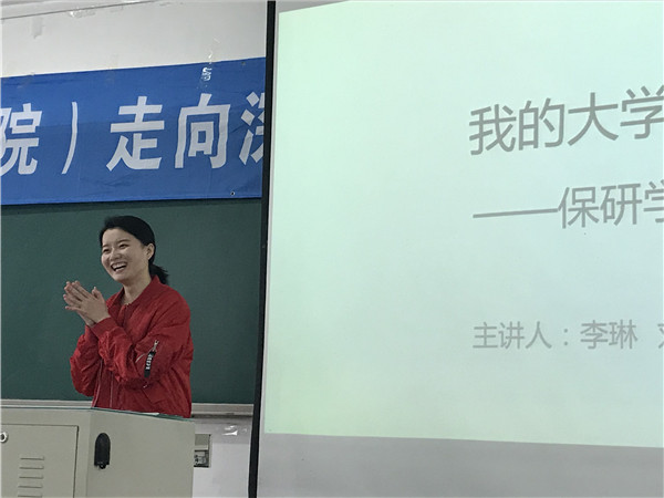 2014级法学一班的刘路路学姐也向我们分享了自己的保研经历。她在李琳学姐阐释考研经验的基础之上进一步深化,和我们探讨了关于备考法律职业考试的经验。刘路路学姐的经验分享以及对于考研的补充发言同样也赢得了在场同学的热烈掌声。最后,法学院(海警学院)副院长滕鹏为此次“我的大学------保研学姐经验分享”的主题交流报告会做了总结性发言。他号召2015级全体同学向李琳、刘路路学姐学习,努力备战研究生考试,为自身未来的发展而努力奋斗。