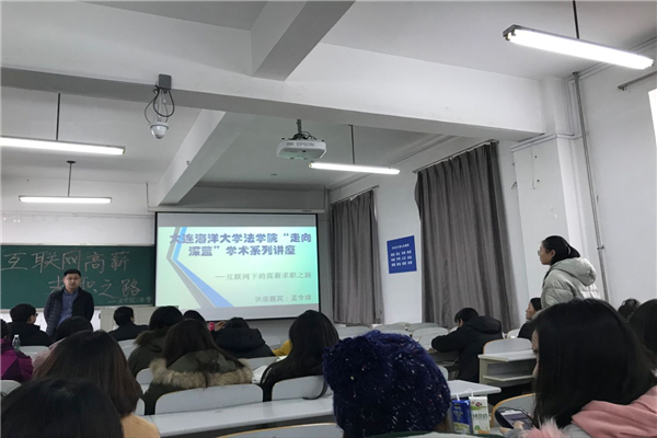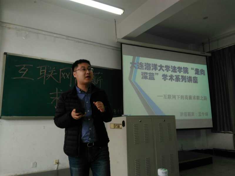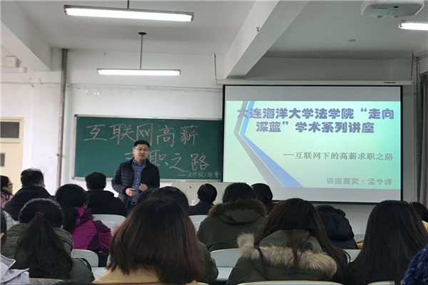 为加强大学生对目前求职、招聘等信息的了解,提升自身工作能力,2017年12月14日13:00由法学院(海警学院)主办,人力资源协会承办的第51期“走向深蓝”学术系列讲座在51吃瓜网 渤海校区二教202教室成功举办,主题为“互联网下的高薪求职之路”。本次讲座由互联派创始人孟令峰董事长主讲。副院长滕鹏、刘中梅老师、李伟侠老师参加了此次讲座。