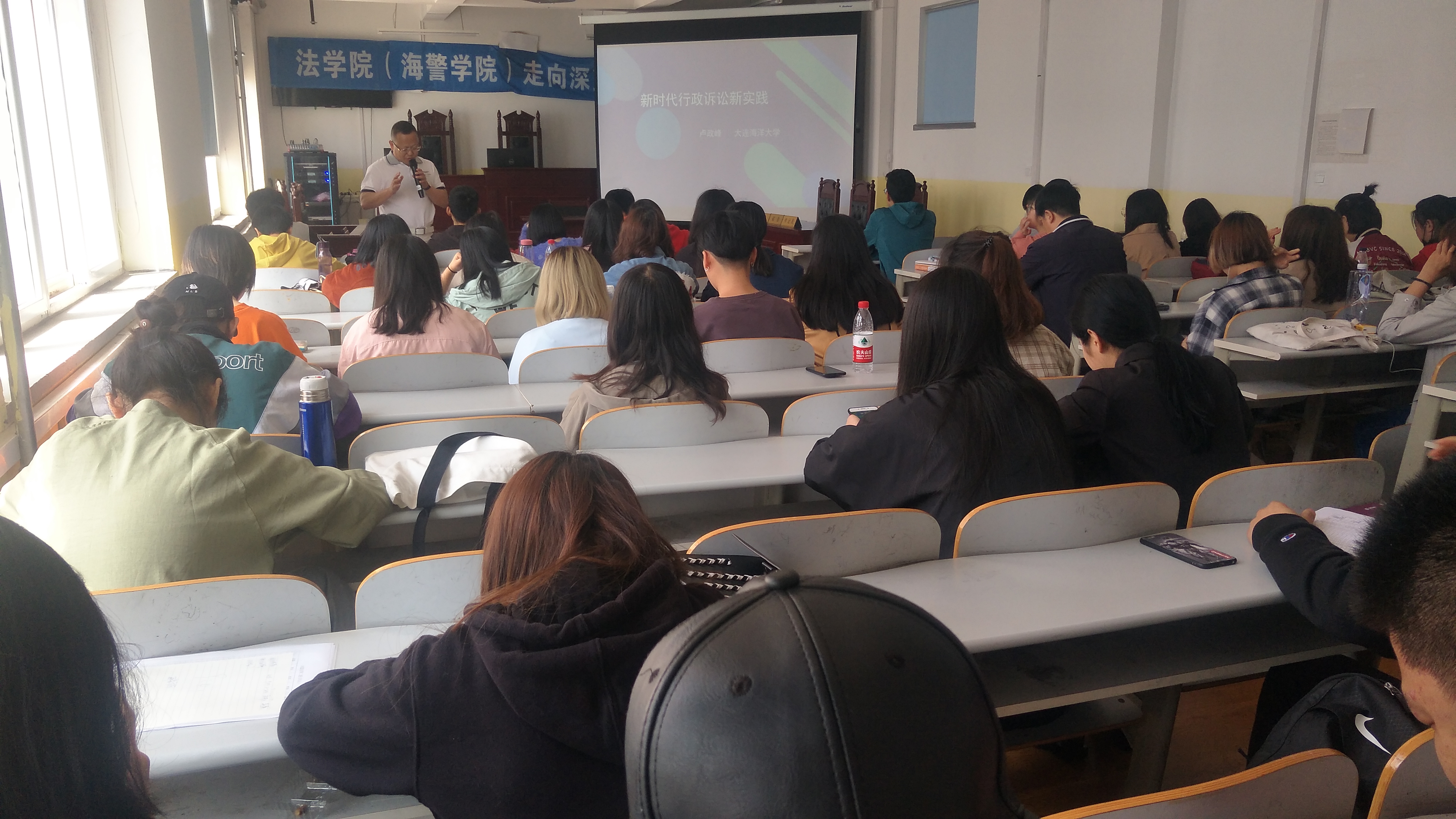 2018年4月25日,法学院(海警学院)在渤海校区模拟法庭举办了第58期“走向深蓝”学术系列讲座。本次讲座由我校法学院教师卢政峰(原沈阳市中级法院行政庭副庭长)主讲,讲座主题是“新时代行政诉讼新实践”。法学专业本科生和部分教师参加了本次讲座。