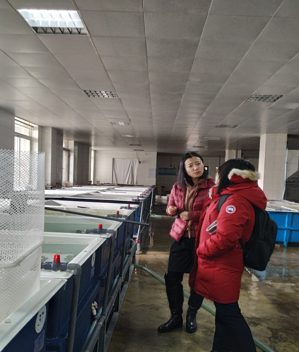 讲座结束以后,单德赛博士还参观了我校农业农村部北方海水增养殖重点实验室,水产与生命学院副院长湛垚垚为单德赛介绍了各个实验室的用途以及各种实验仪器设备的使用,讲解了苗种繁殖、实验培养等实践技术。