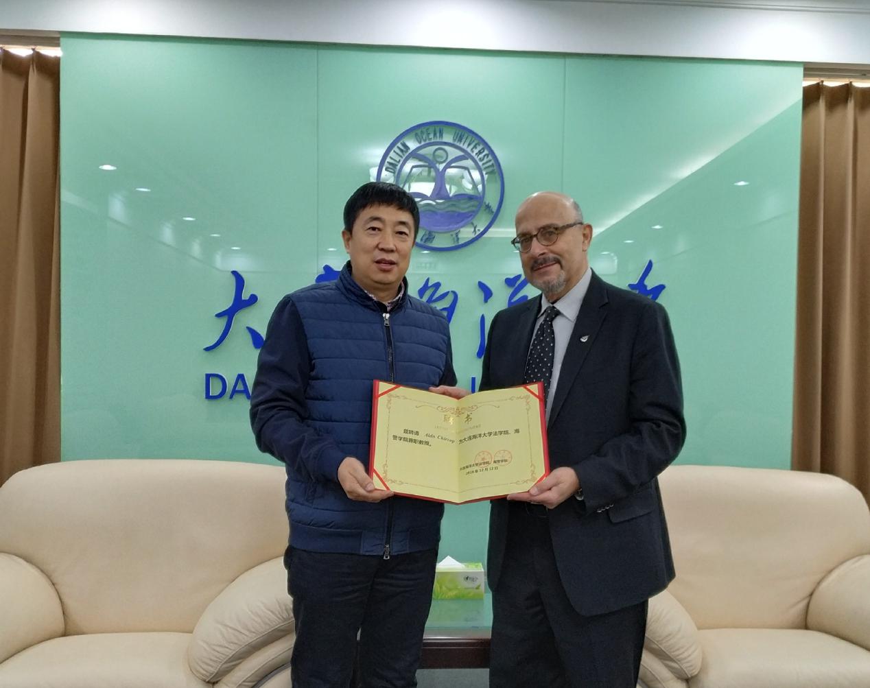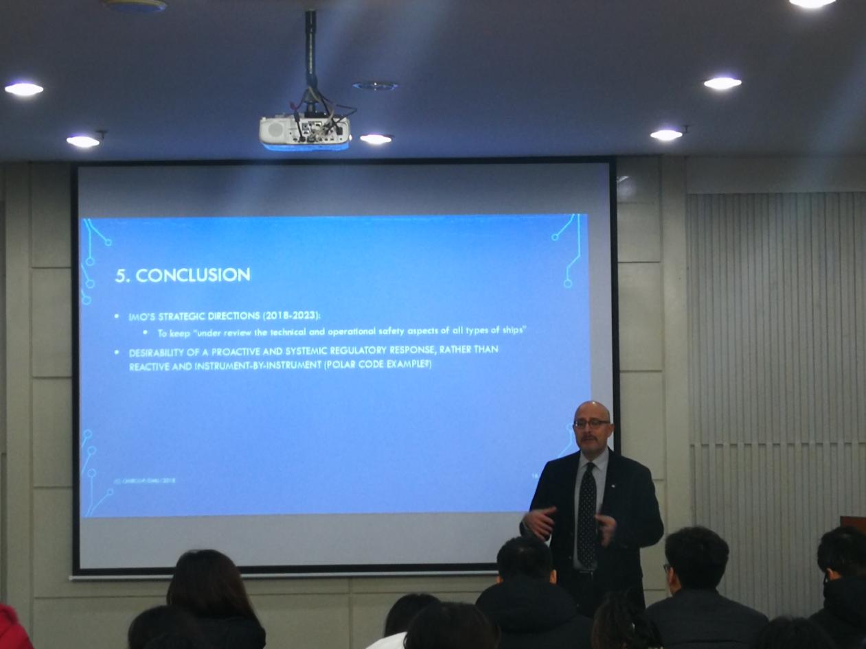 会谈结束后,裴兆斌院长为Aldo Chircop教授颁发了兼职教授证书,Aldo Chircop教授为我校研究生进行了主题为“The accommodation of maritime autonomous surface ships in current regulation”的讲座。Aldo Chircop教授就海上水面自动船舶的法规适用、海上水面自动船舶的安全、环保等一系列问题阐述了自己的观点。参加讲座的师生就各自关注的问题同Aldo Chircop进行了交流。