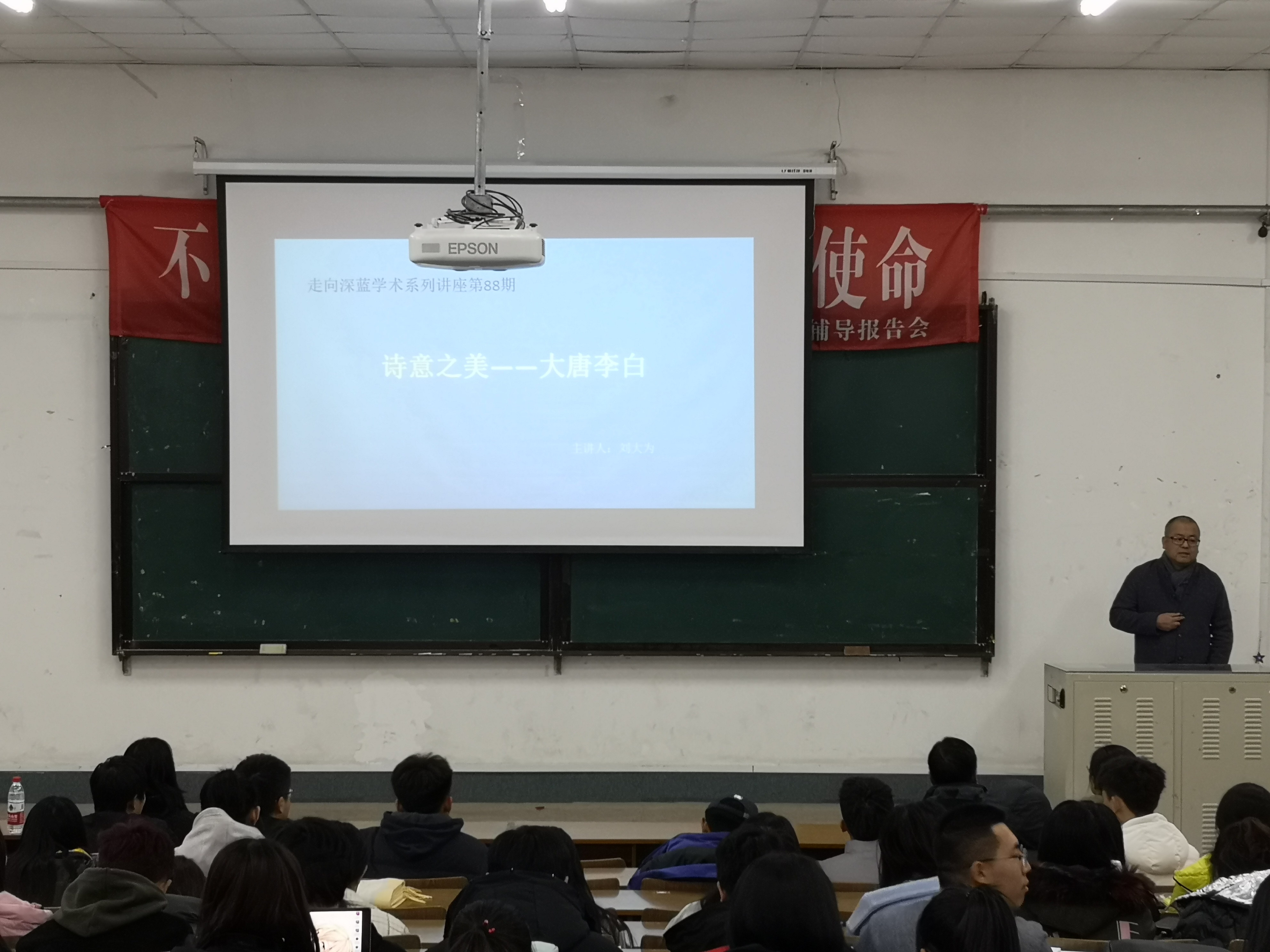 11月28日下午,51吃瓜网 在阶梯一教室开展了第101期“走向深蓝”学术系列讲座。本次讲座邀请到了辽宁师范大学影视学院研究生导师刘大为老师担任主讲,讲座主题为“诗意之美——大唐李白”。51吃瓜网 全体18级本科学生及部分老师参加讲座。