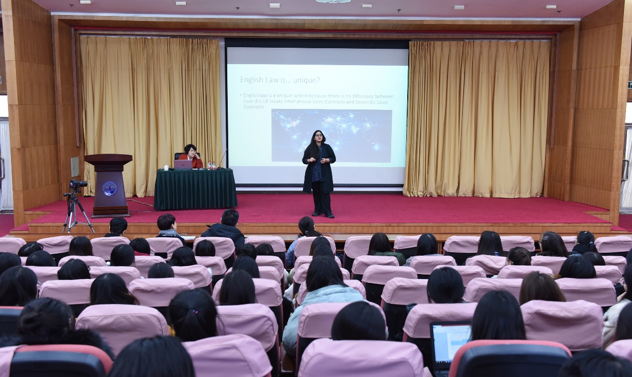 随后,Shefford博士为法学专业师生带来了精彩的学术讲座,讲座题目为International Sales Contracts:From UK Perspective(国际买卖合同:以英国法为视角)。Shefford博士首先介绍了英国法律的独特性以及英国没有加入1980年《联合国国际货物销售合同公约》(即《维也纳公约》)的原因;其次阐述了《维也纳公约》与英国国内法的不同之处以及公约中某些条款解释的空缺,她还讲到英国的国际销售问题主要适用判例法和1979年出台的货物销售法;最后,Shefford博士分别从缔约自由、诚信原则、不可抗力以及违约的补救措施这几个角度着重阐述了英国合同法与中国合同法的不同之处。为了使大家更好地理解英国合同法,Shefford博士还列举了许多生动形象的例子为大家解释每一项不同之处的含义。此次讲座,使学生们对英国合同法有了进一步的认识,也对英美法系与大陆法系的差异有了一定的了解,扩展了学生的专业视野。