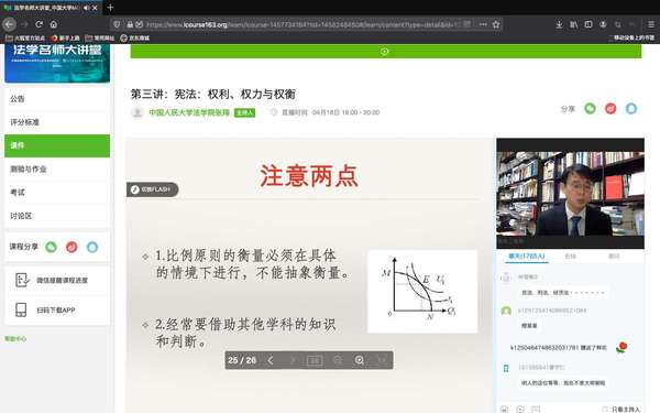 为了开拓疫情防控期间学生的学术视野,丰富学生的专业课余生活,法学专业在传统品牌学术活动走向深蓝学术系列讲座中创设“云端”名师大讲堂栏目,旨在组织法学专业学生在线观看国内外法学名师学术讲座。2020年4月16日19:00-20:00,“云端”名师大讲堂第三讲开播。法学教研室会同法硕中心组织法学专业本科生和法律硕士研究生在线收看了中国大学MOOC开放的学术讲座 “宪法:权利、权力与权衡”,由中国人民大学法学院张翔教授主讲。