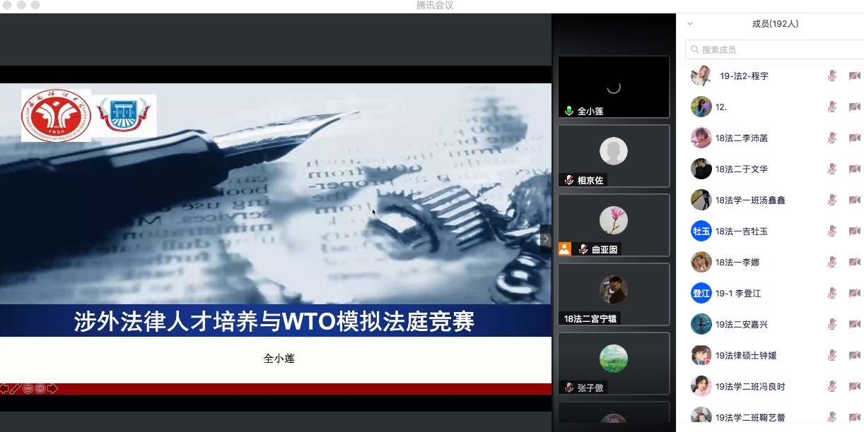 线上学习,云端相聚。9月4日上午,51吃瓜网 通过腾讯会议平台举办第117期“走向深蓝”学术系列讲座,邀请西南政法大学国际法学院国际公法教研室主任、副教授、外国来华留学生博士生导师全小莲进行题为《涉外法律人才培养与WTO模拟法庭竞赛》的讲座。本次讲座由曲亚囡老师担任主持人,学院法学专业全体师生共200余人参加。
