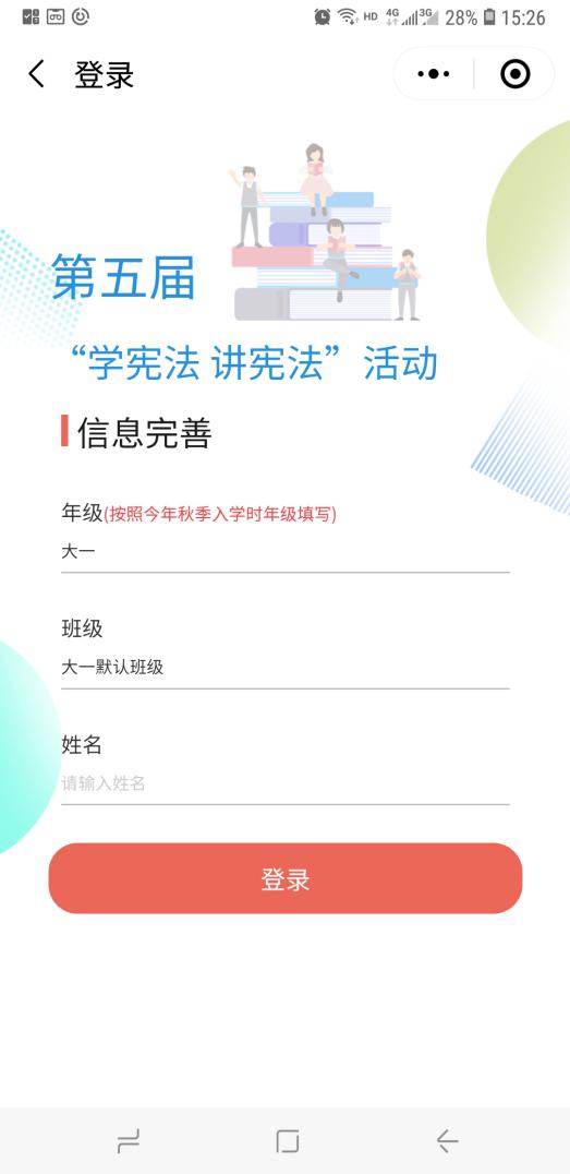 2.进入小程序后,选择年级和输入姓名。本科生登录时年级选择自己所在年级,研究生和教师登录时年级任选,姓名填写自己真实姓名。如下图。