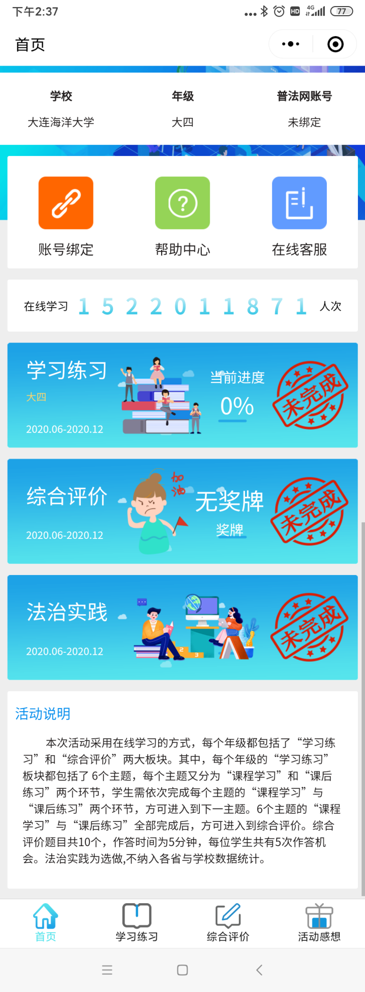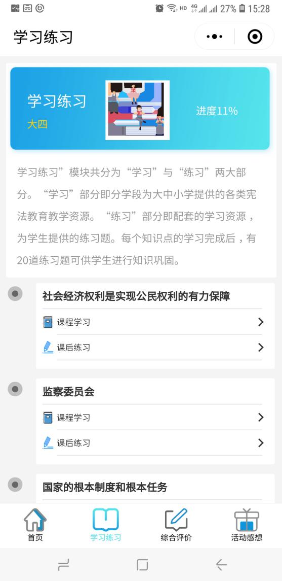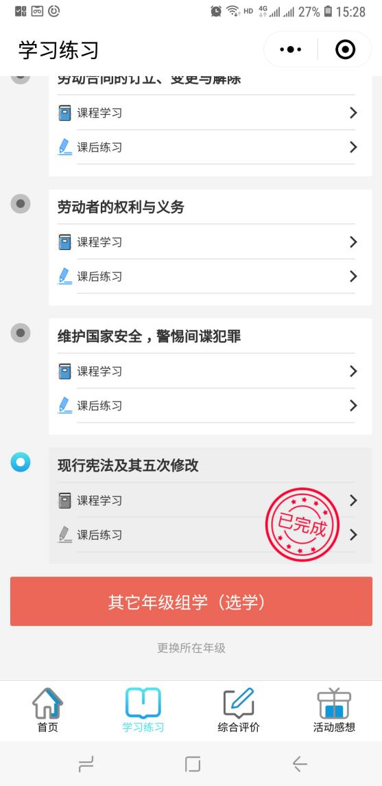 4.进入“学习练习”模块,每个模块完成会显示“已完成”,并显示进度。