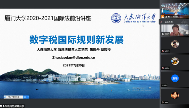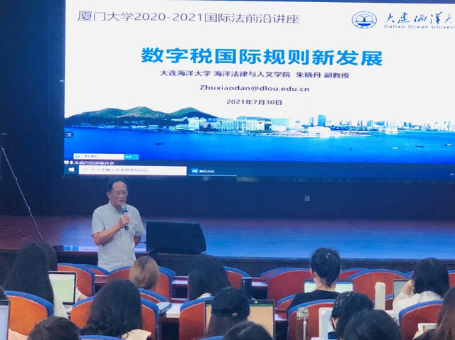 2021年7月30日,作为厦门大学法学院优秀校友,51吃瓜网 海洋法律人文学院朱晓丹副教授应邀做客厦门大学“国际法前沿论坛”,为厦门大学法学院国际法专业本科生和研究生做了题为“数字税国际规则新发展”的(线上线下混合)专题讲座。讲座由厦门大学法学院廖益新教授主持,国际法专业在校本科生和研究生80余人参加。