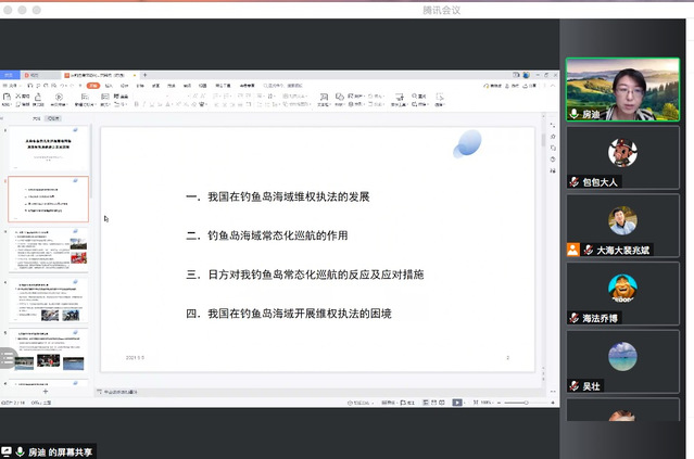 房迪老师的发言题目是《从钓鱼岛常态化巡航看我国海洋维权执法的进步及其困境》。房迪老师从我国对钓鱼岛海域维权执法出发,为我们系统、深入地介绍了我国在钓鱼岛海域的海洋维权执法的发展、作用和功能,特别是为我们详细介绍了日方对我国钓鱼岛常态化巡航的反应和应对,为我国破解钓鱼岛海域维权执法困境,开展进一步的、高效的海域维权执法提出了建议。