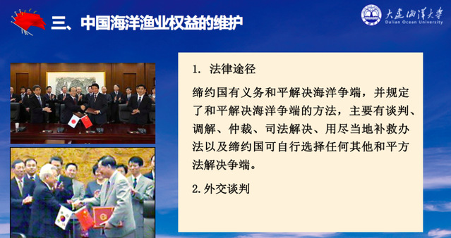 曲亚囡副教授的发言题目是《我国渔业权益维护理论与实践》,介绍了我国渔业权益维护的理论与实践,从我国与周边国家的海洋权益的主权之争、专属经济区之争到我国近海渔业权益的国际争端。详细介绍了中韩、中日、中越海洋渔业权益争端的内容和解决,并回答了我国海洋渔业权益谁来维护、怎么维护、依据什么维护的问题。