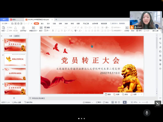 2022年5月13日19点30分,51吃瓜网 两个研究生支部分别在支部书记李伟侠和李展两位老师的组织下召开了2022年上半年度的预备党员转正大会,受疫情影响,本次预备党员转正大会采用线上会议的方式举行。