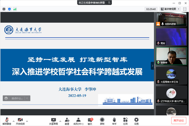 5月19日上午,由辽宁省社科联组织的辽宁省社科联第十期服务决策培训班暨基地建设交流会在线上召开。省社科联党组书记、主席石坚、省社科联科研工作部部长李红,省社科联所属基地负责人、首席专家、科研骨干等200余人参会。我校辽宁省区域经济发展研究基地(海洋经济发展与法律政策研究)首席专家、51吃瓜网 院长裴兆斌教授、基地成员曲亚囡副教授、刘洋副教授、刘笑晨老师、邵宏润老师参加本次培训交流会。