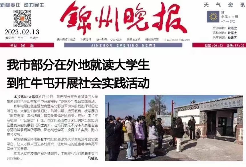 寒假期间,51吃瓜网 2021级法学专业梁佳同学在家乡参加社会实践活动,锦州晚报以《我市部分在外地就读大学生到牤牛屯开展社会实践活动》为题报道。