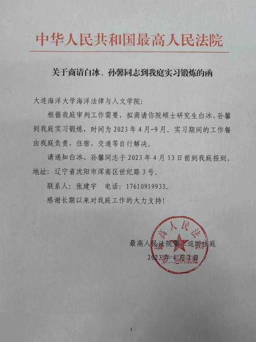 3月14日,最高人民法院第二巡回法庭开展第十三批实习助理选拔工作,来自众多高等院校的优秀法学生积极参与本次选拔。经严格审查,我校2021级法律硕士研究生白冰、孙馨入选最高人民法院第二巡回法庭实习助理,实习期为期六个月。