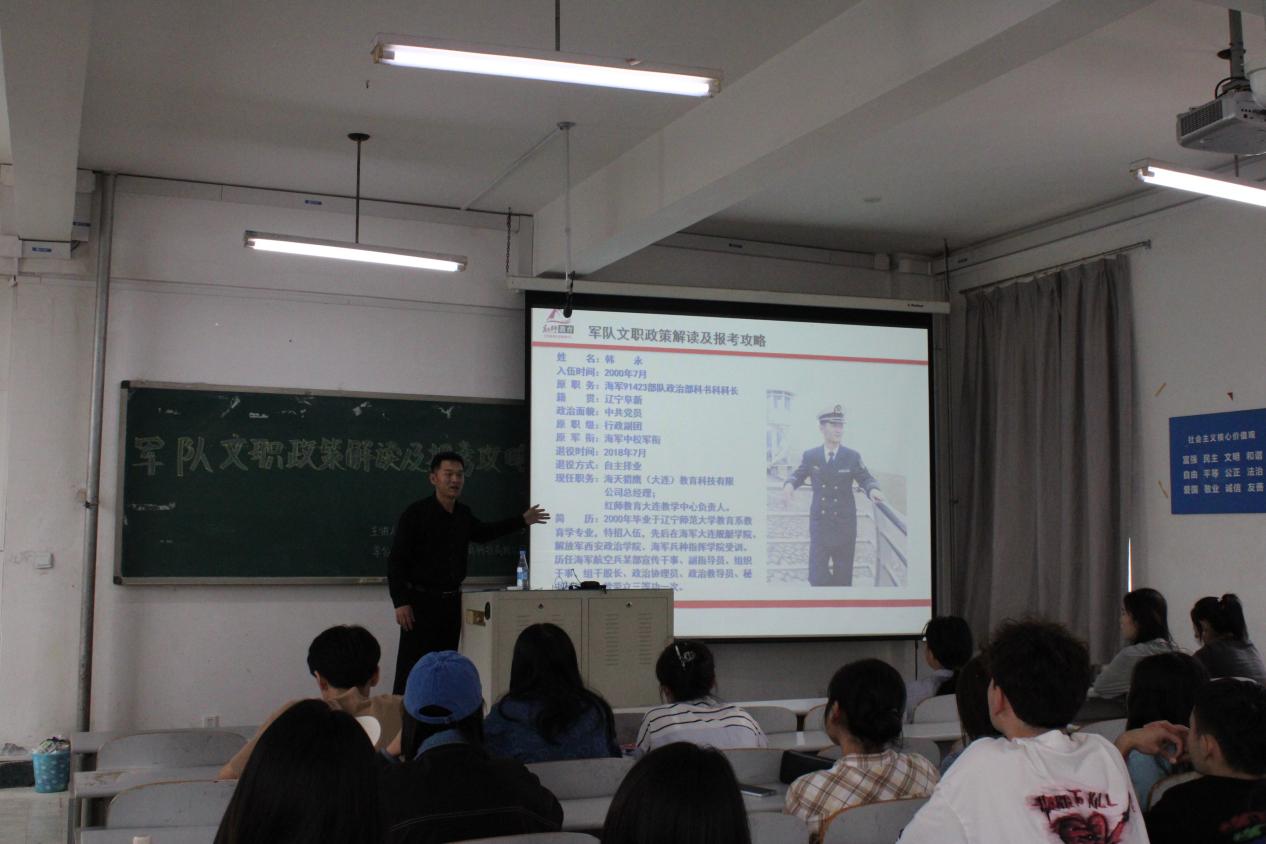 于渤海校区教室举办军队文职政策解读及报考攻略专题讲座。本次讲座由辅导员张琳琳主持,海军某部队退伍军人韩永主讲,学院各专业学生代表参加。