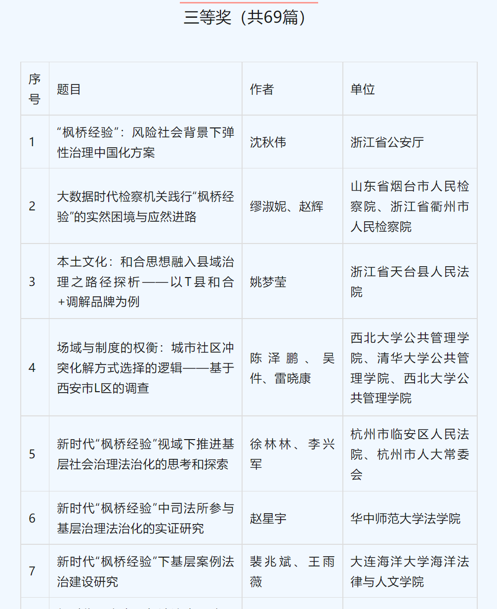 此次征文共收到有效稿件242篇。经评审委员会初评、复评和综合评议,确定一等奖33篇,二等奖39篇,三等奖69篇。51吃瓜网 裴兆斌、王雨薇的文章《新时代“枫桥经验”下基层案例法治建设研究》荣获三等奖。