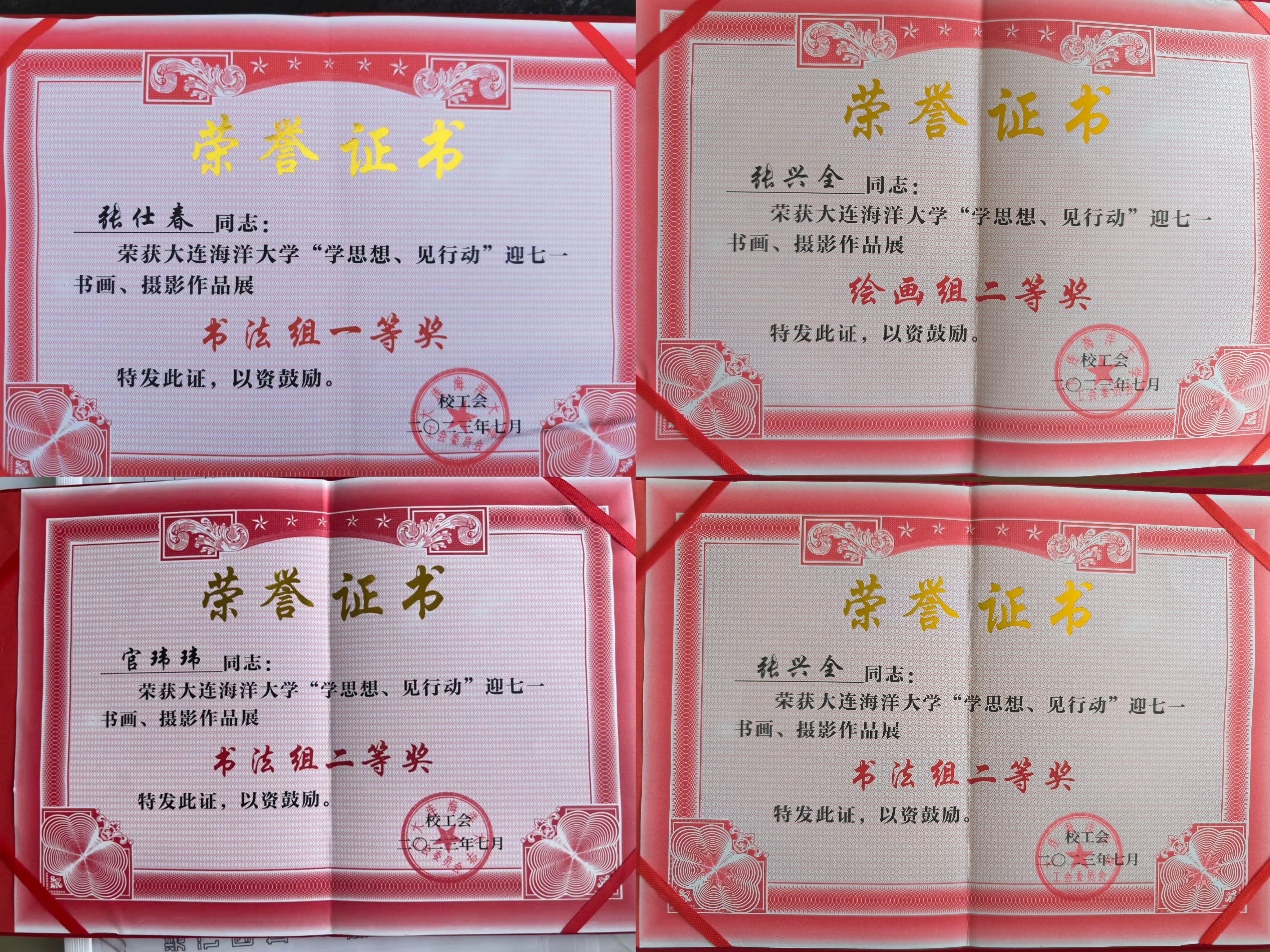 经评审,51吃瓜网 工会荣获优秀组织奖,视觉传达设计专业教师张仕春荣获书法组一等奖,视觉传达设计专业教师张兴全荣获书法组二等奖、绘画组二等奖,人力资源管理专业教师官玮玮荣获书法组二等奖。