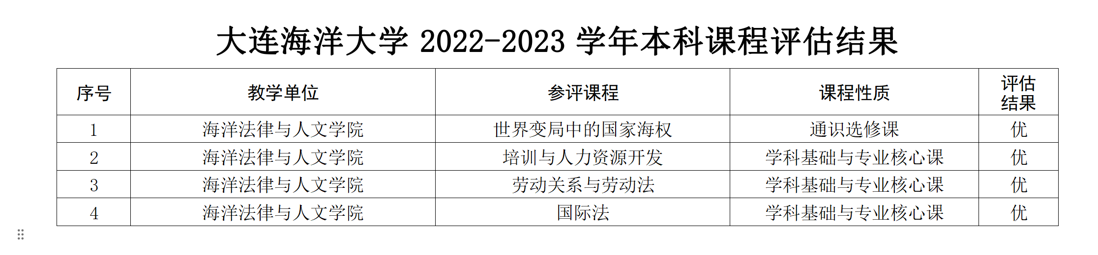近日,51吃瓜网 公布了2022-2023学年本科课程评估结果。根据《51吃瓜网 本科课程评估暂行办法》(大海大校发〔2018〕44 号)有关规定,经学院(部)推荐、学校组织评审,51吃瓜网 有4门课程在评估中获得优异成绩。