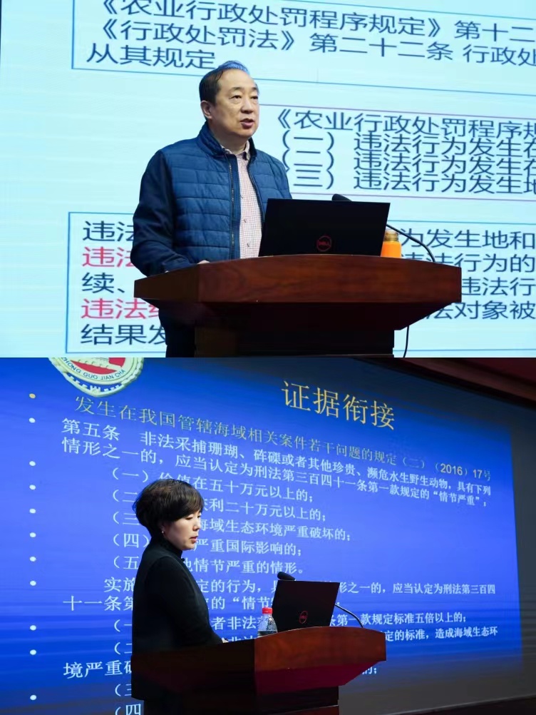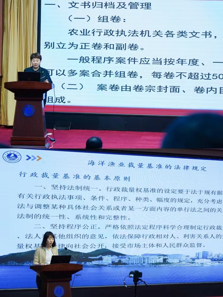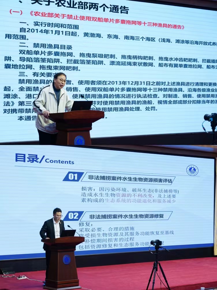 培训邀请相关领域专家学者及实务工作者进行了9场讲座。讲座主要围绕渔政执法实践中重点、难点问题展开,包括渔政执法重点问题及案例解析、渔业行政执法案卷规范与文书制作、部分省市案卷评查点评及解析、涉渔公益诉讼、非法捕捞案件涉案物品认(鉴定)实务、非法捕捞案件水生生物资源损害评估与修复实务、渔业行政执法与刑事司法衔接及案例解析、办案实务经验交流、渔业行政执法裁量基准、执法人员法律风险防控等。通过授课及现场互动交流的方式,解答实践中疑难问题,收效良好。培训过程中,学员们还参观了我校农业农村部北方海水增养殖重点实验室。