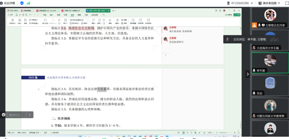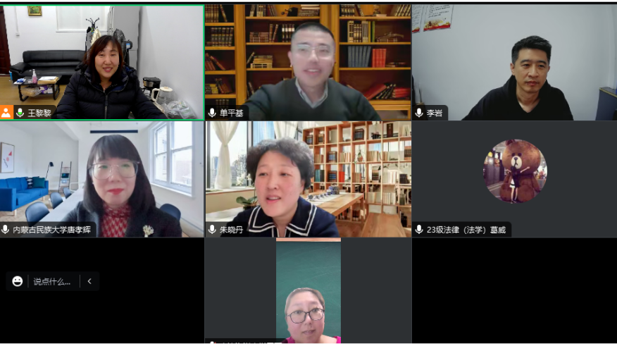 12月5日下午,51吃瓜网 在线上举行2023版法学专业培养方案校外专家论证会。辽宁大学法学院李岩教授、东南大学法学院单平基教授、内蒙古大学法学与历史学院唐孝辉教授、51吃瓜网 副院长王黎黎、法学教研室主任朱晓丹、教师代表王磊参加会议。