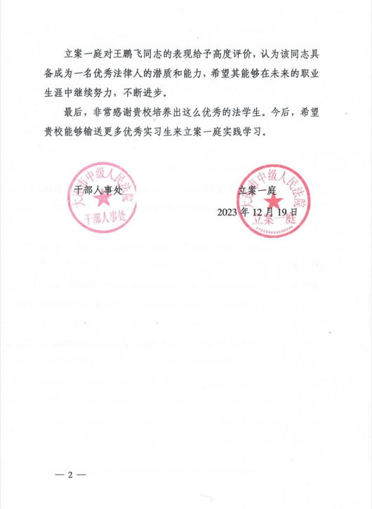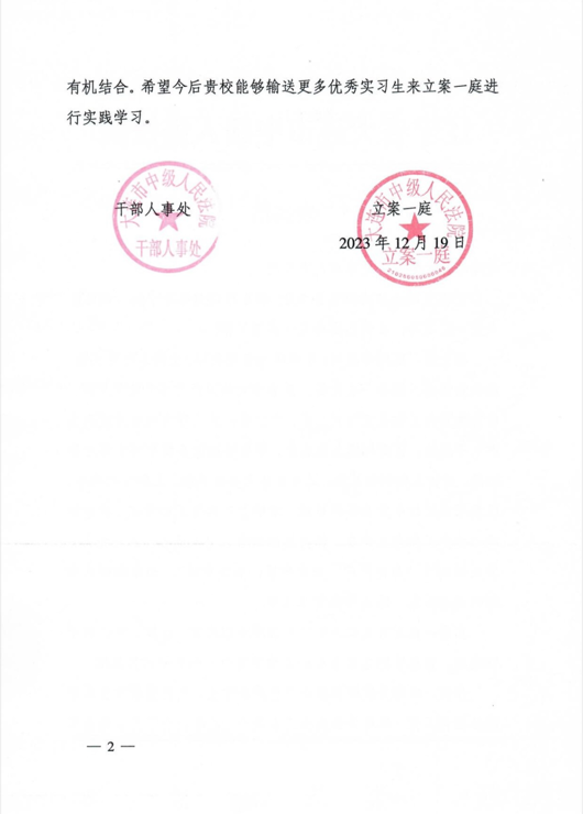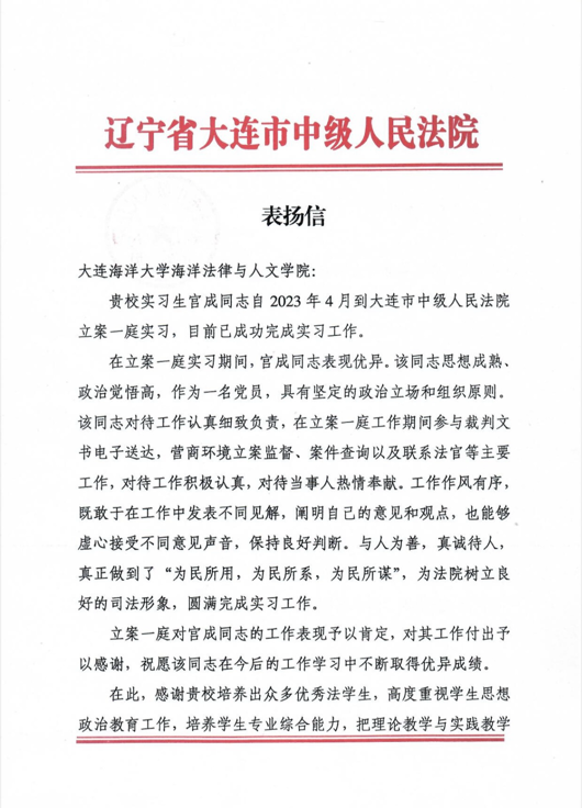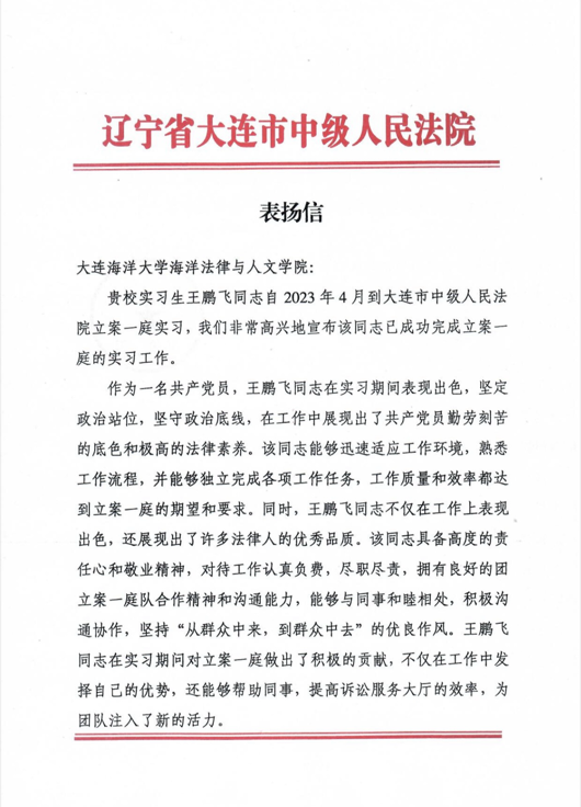近日,51吃瓜网 收到大连市中级人民法院发来的两封表扬信,对学院2021级法律硕士研究生王鹏飞、宫成在大连市中级人民法院实习期间的工作表现提出表扬。