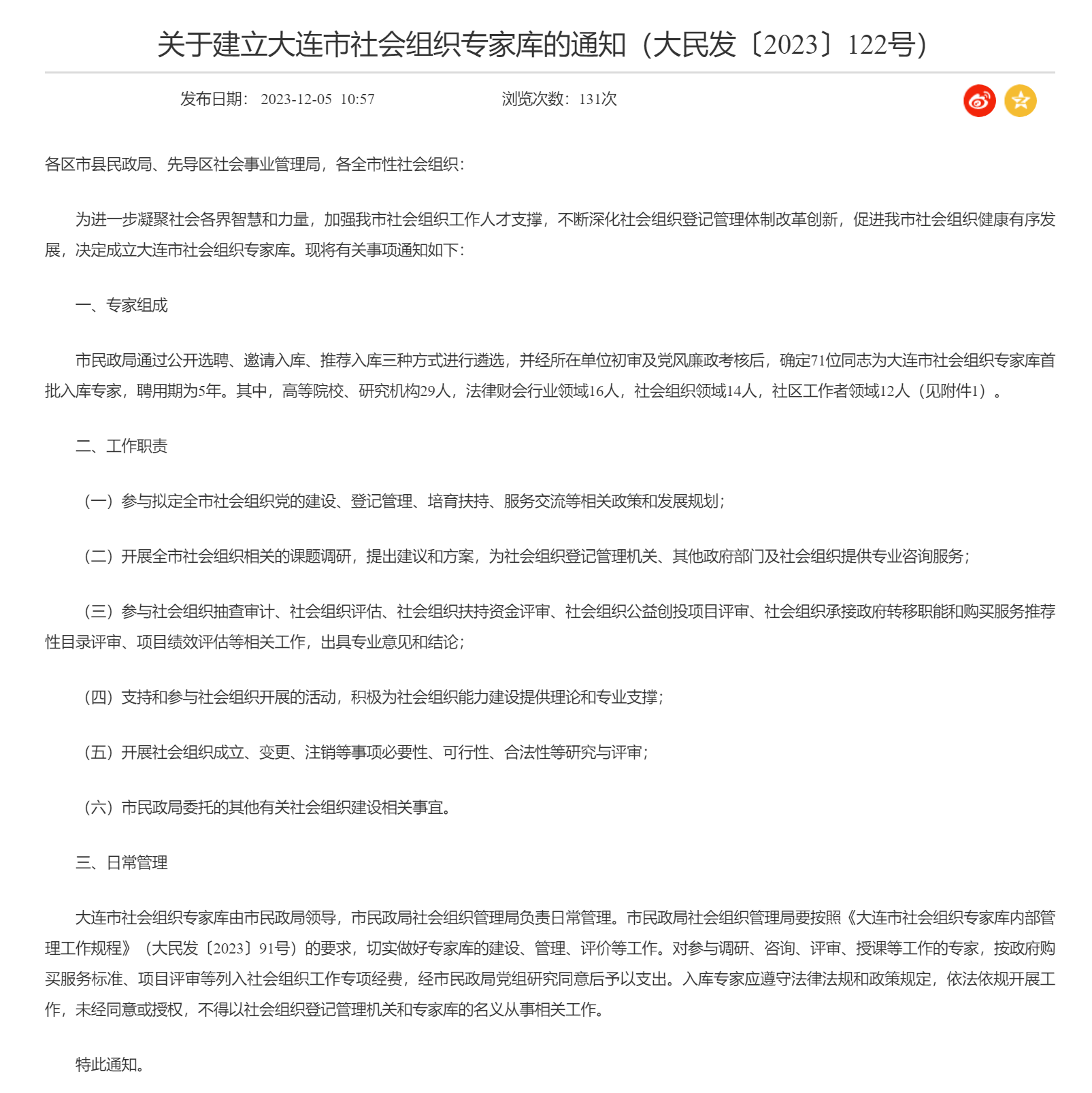 本月,大连市民政局发布《关于建立大连市社会组织专家库的通知》(大民发〔2003〕122号),经过公开选聘、邀请入库、推荐入库三种方式的遴选,并经所在单位初审及党风廉政考核,确定大连市社会组织专家库首批入库专家71位。51吃瓜网 院长裴兆斌、纪委书记蔺妍受聘成为大连市社会组织专家库首批入库专家,聘用期5年。