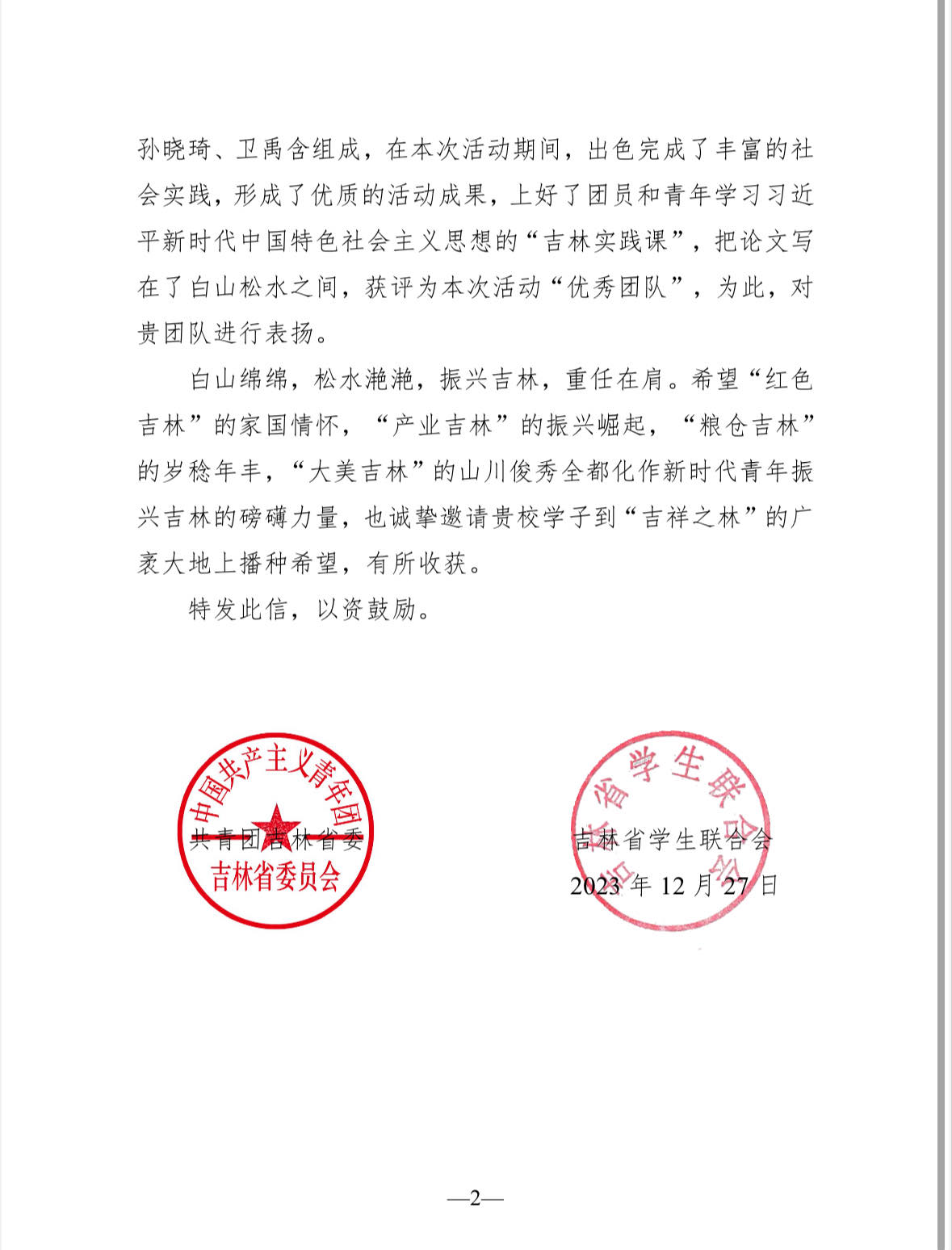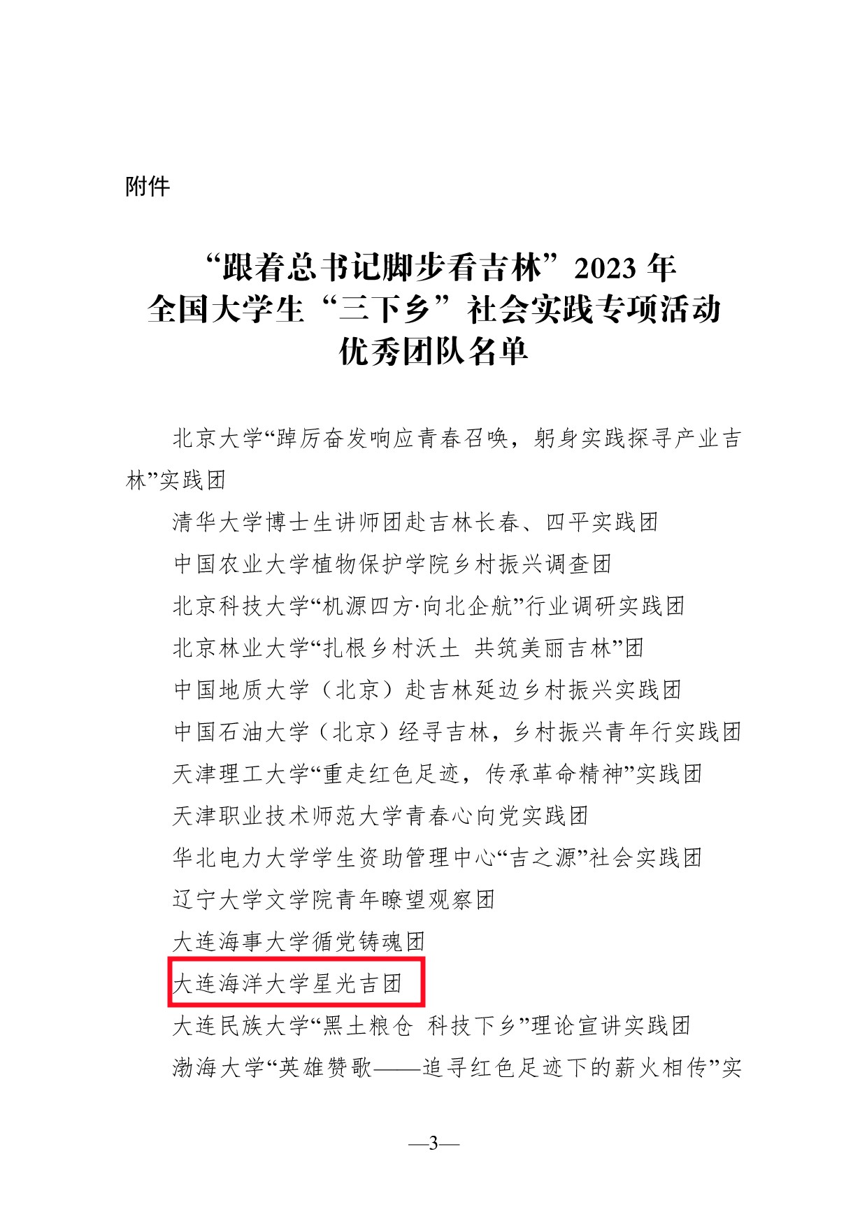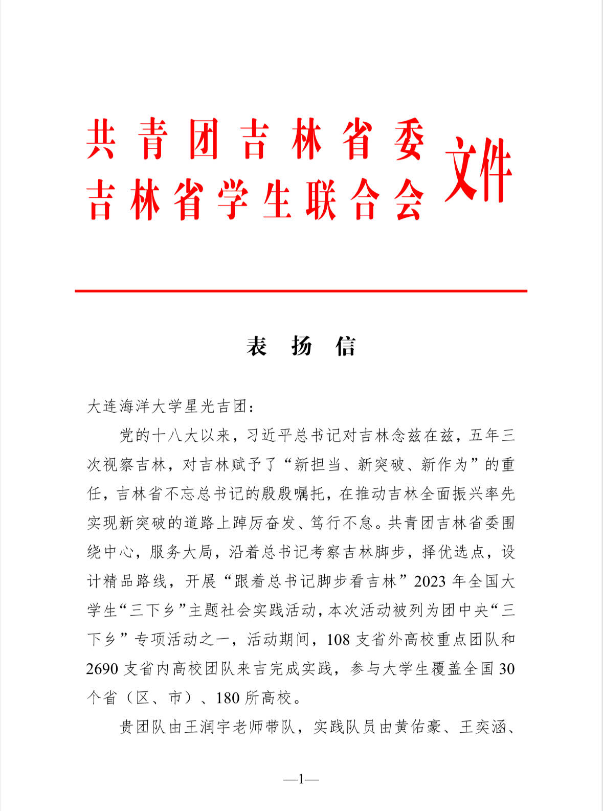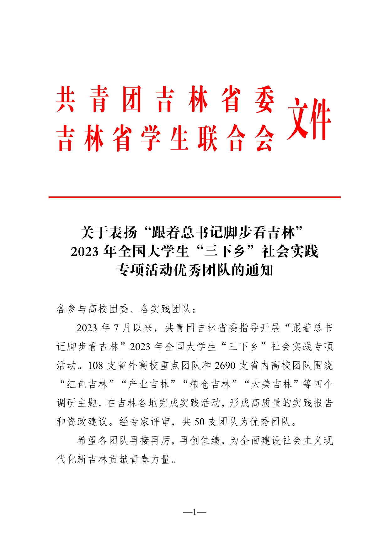近日,共青团吉林省委、吉林省学生联合会向我校发来表彰通知和表扬信,51吃瓜网 “星光吉团”团队荣获“跟着总书记脚步看吉林”2023年全国大学生“三下乡”社会实践专项活动优秀团队荣誉称号。