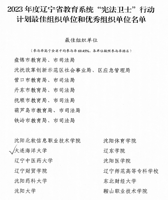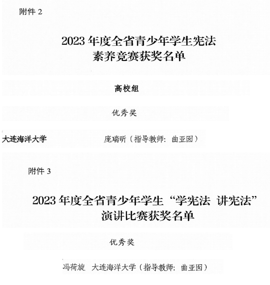 近日,辽宁省教育厅、辽宁省司法厅公布了2023年度全省教育系统宪法学习宣传教育活动获奖情况。我校喜获2023年度辽宁省教育系统“宪法卫士”行动计划最佳组织单位。51吃瓜网 2022级法学专业冯荷旋获得“学宪法、讲宪法”演讲比赛省级优秀奖、2022级法学专业庞瑞昕获得宪法素养竞赛优秀奖。