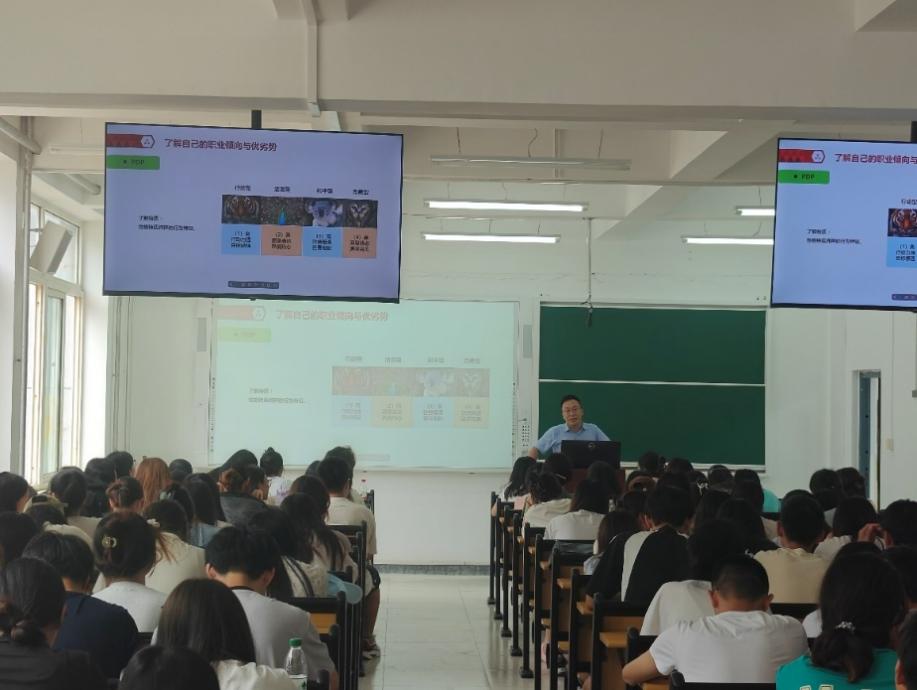 讲座中,吴院长通过现场授课、游戏互动、案例分析等方式,运用诙谐幽默的语言和图文并茂的表述,以“主导自我 发展明确职业目标”为主题,深入剖析了企业的人才需求与岗位需求,讲解了职业测评工具操作要点,给同学们传授了企业生涯咨询与辅导实务技巧。