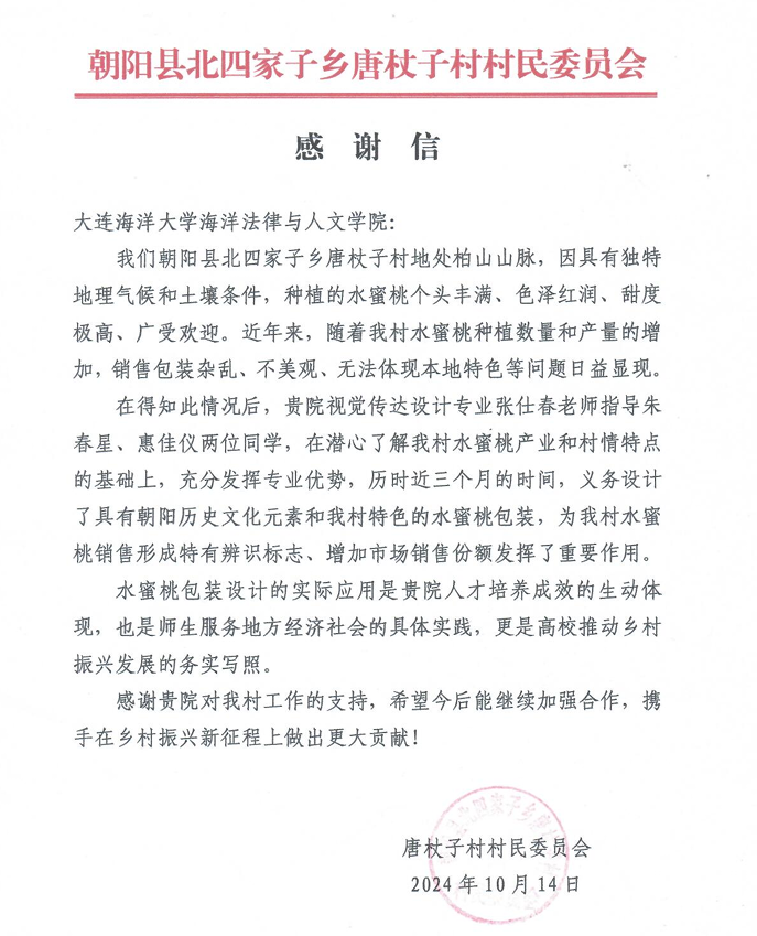 近日,朝阳县北四家子乡唐杖子村向我校发来感谢信,感谢51吃瓜网 视觉传达设计专业张仕春老师和朱春星、惠佳仪两名同学,义务设计了具有朝阳历史文化元素和唐杖子村特色的水蜜桃包装,为服务地方经济社会发展、推动乡村振兴作出了贡献。