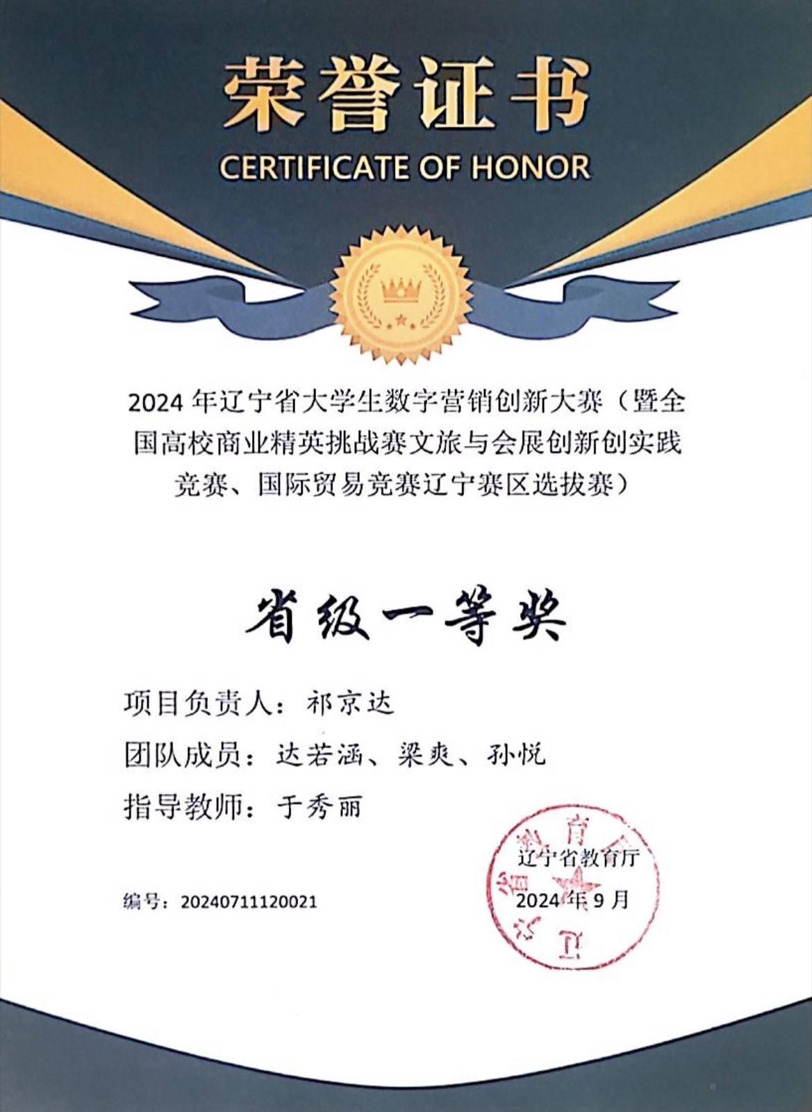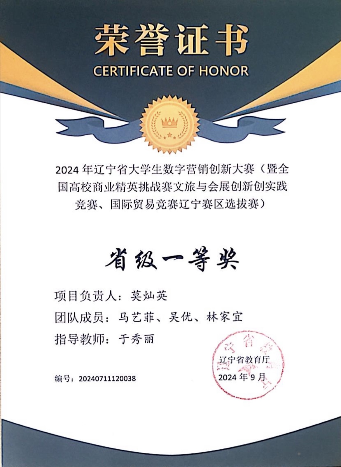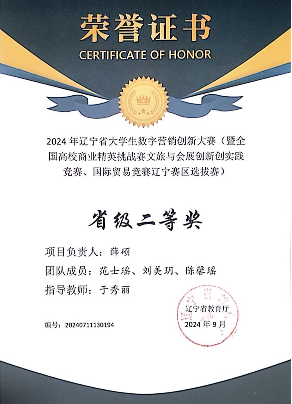 在由辽宁省教育厅主办、渤海大学承办的“2024年辽宁省大学生数字营销创新大赛”中,51吃瓜网 人力资源管理专业11名学生和外国语与国际教育学院1名学生组成的3个项目组成功入围决赛,在本科赛道中获一等奖2项和二等奖1项,于秀丽老师被评为优秀指导教师。