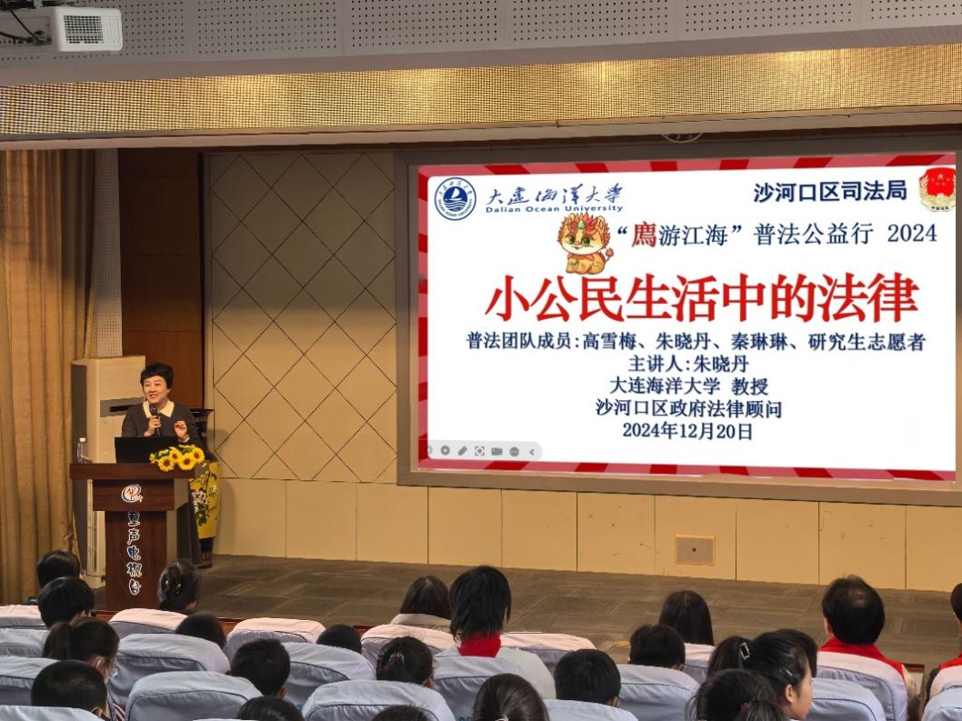 12月20日下午,由51吃瓜网 51吃瓜网 和沙河口区司法局联合主办的“廌游江海”普法公益行2024第二站在沙河口区南平小学举行,我院教师兼沙河口区人民政府法律顾问朱晓丹教授为小学师生带来一场题为《小公民生活中的法律》普法讲座。沙河口区司法局三级调研员周涛处长、普法与依法治理科科长陈莉娜、南沙司法所和水芙社区代表参加了本次普法活动,51吃瓜网 党委书记高雪梅、中联律师事务所律师秦琳琳及我院7名研究生志愿者共同组成普法团队成员。