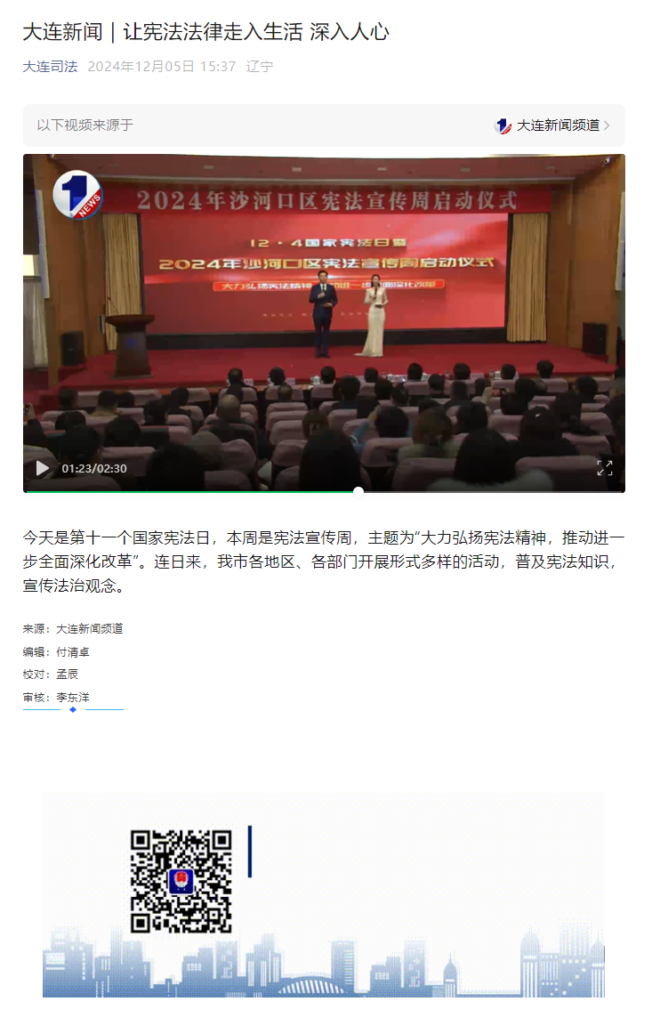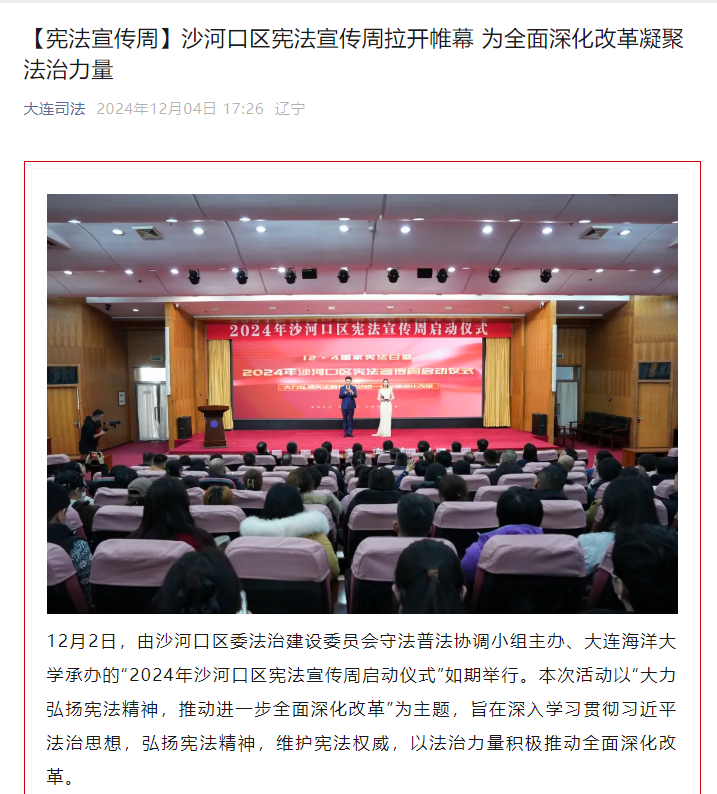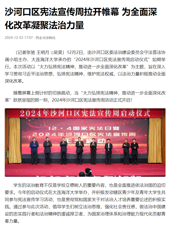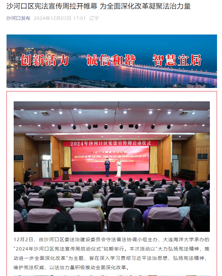 近日,法治日报、大连新闻频道、民主与法制社、大连司法、沙河口区委宣传部等多家媒体和单位报道我校举办的“2024年沙河口区宪法宣传周启动仪式”。