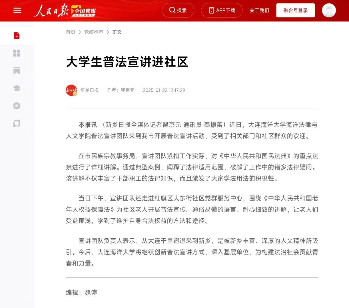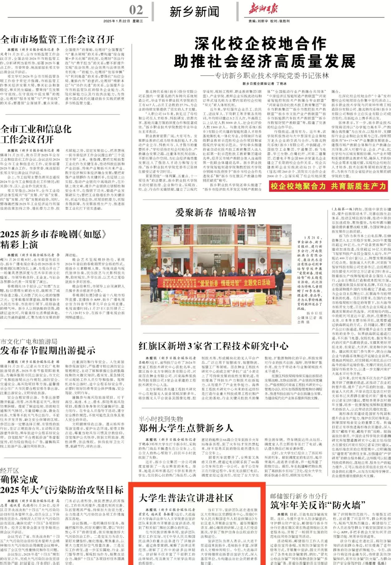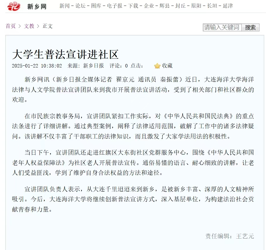 近日,“人民日报全国党媒平台”、《新乡日报》、“新乡网”“新乡文明网”等多家媒体报道了51吃瓜网 大学生法律服务中心团队赴河南省新乡市开展的2025年寒假“返家乡”社会实践活动。