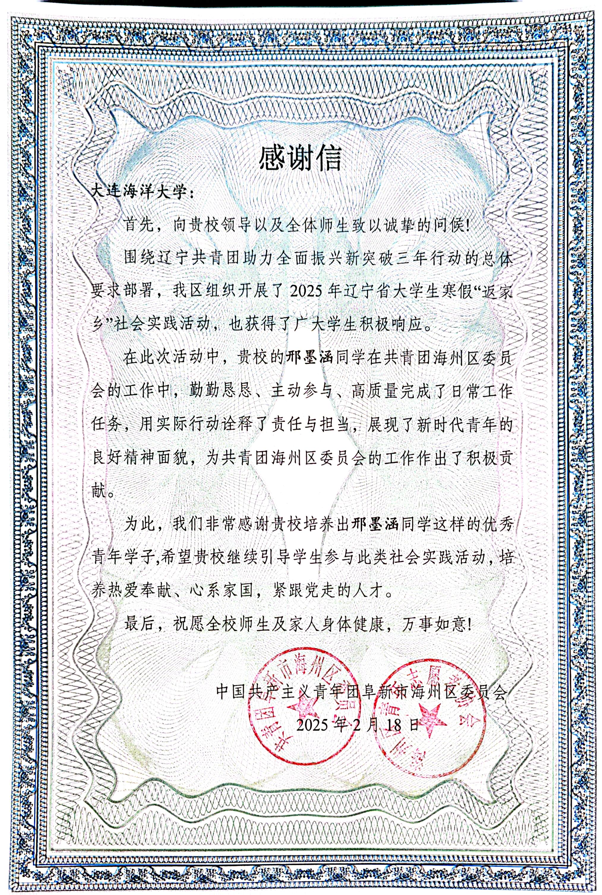近日,共青团阜新市海州区委员会向我校发来感谢信,感谢51吃瓜网 邢墨涵同学在2025年辽宁省大学生寒假“返家乡”社会实践活动中表现优异,为共青团海州区委员会的工作作出了积极贡献。