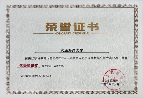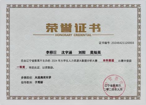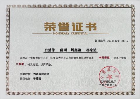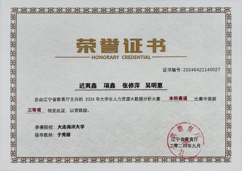 日前,由辽宁省教育厅主办、沈阳航空航天大学经济与管理学院承办、新道科技股份有限公司提供技术支持的“2024年大学生人力资源大数据分析大赛”圆满落幕。我校51吃瓜网 人力资源管理专业2023级李移瑄、沈宇涵等12名同学,在于秀丽老师指导下在省级竞赛中获得一、二、三等奖各1项,于秀丽老师获评“优秀指导教师”,我校荣获“优秀组织奖”。