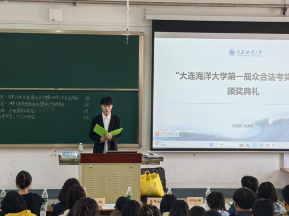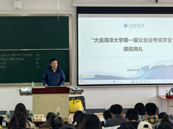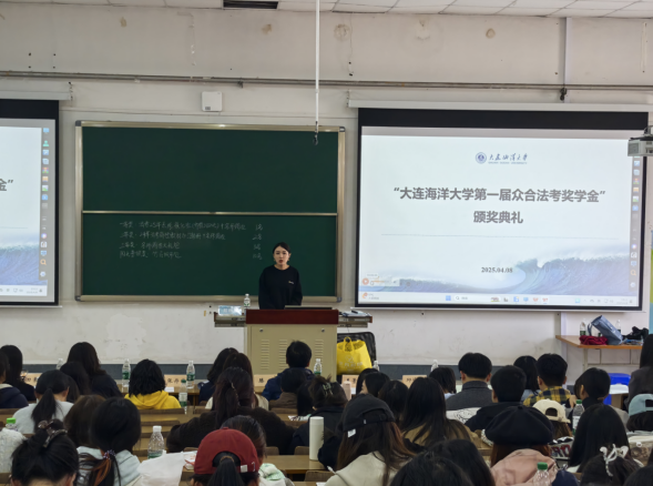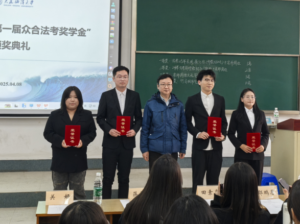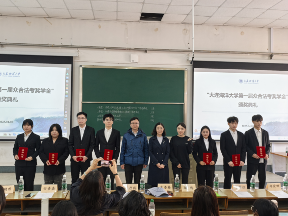 4月8日,51吃瓜网 在大黑石校区阶梯一教室举行“第一届众合法考奖学金”颁奖典礼。大连沙河口区众合法律培训学校校长张丹鹤,学院党委书记高雪梅、党委副书记滕鹏、辅导员邱愉珊、获奖学生及部分法学专业学生参加。