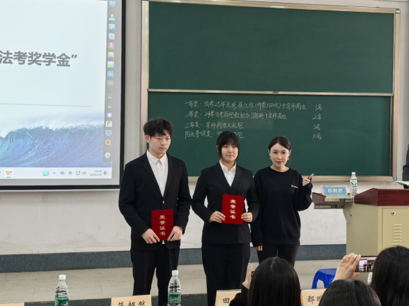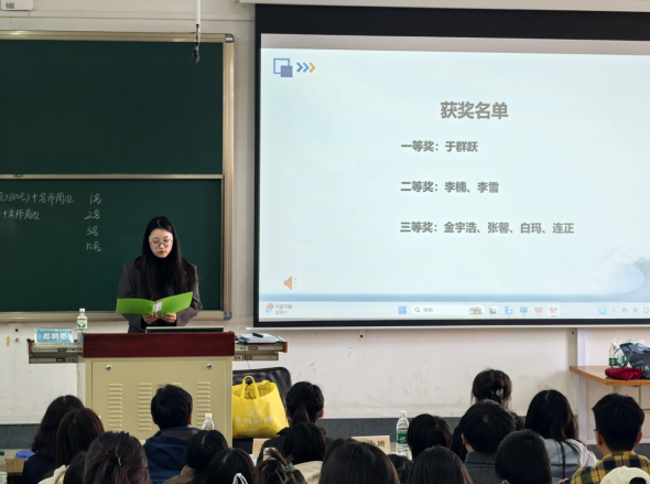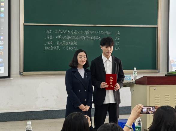 仪式上,邱愉珊宣读了获奖学生名单,高雪梅、张丹鹤、滕鹏分别为获得一等奖、二等奖、三等奖的学生颁奖。